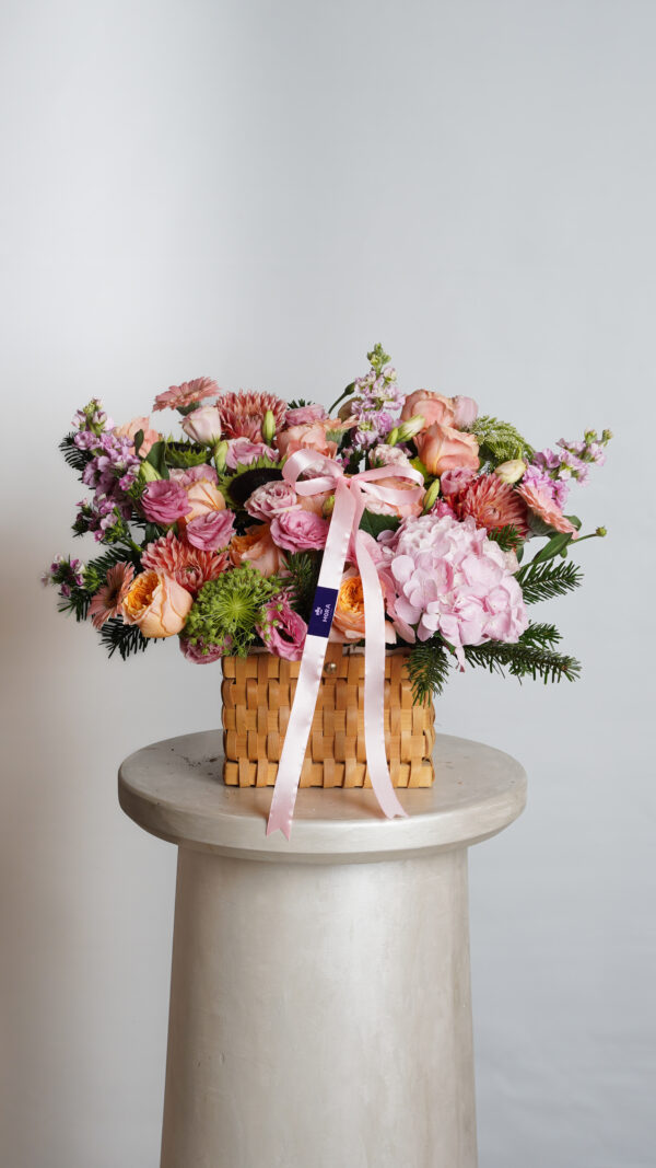 Description: A delicate basket arrangement of soft pinks, warm peach tones, and gentle greenery, designed to feel tender, graceful, and quietly romantic.