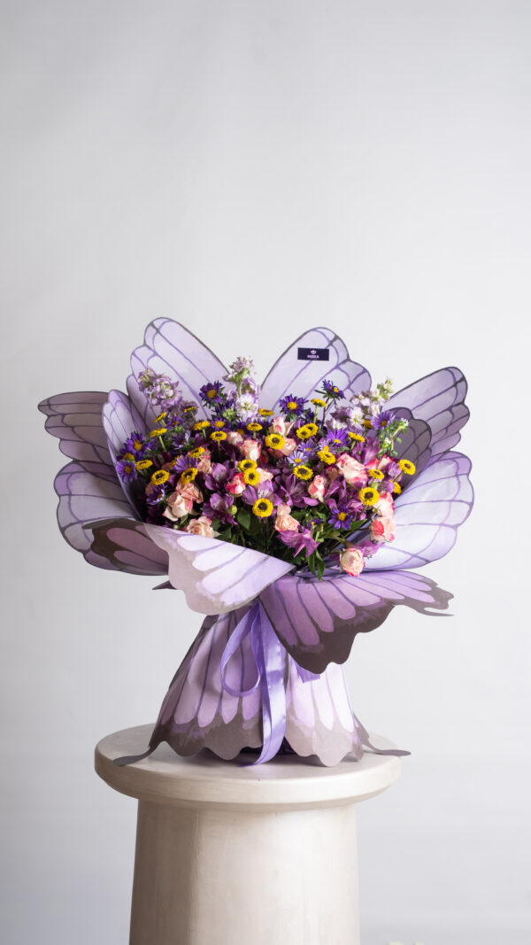 Description: A whimsical bouquet inspired by butterfly wings featuring lavender lisianthus lilac asters and soft yellow accents wrapped in translucent lilac paper Butterfly captures lightness grace and artistic beauty a bouquet that feels like a gentle breeze in bloom