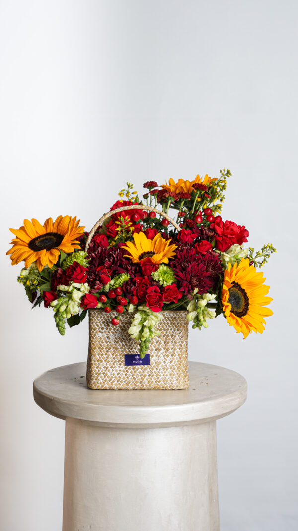 Description: A warm and vibrant arrangement featuring radiant sunflowers blended with rich red florals and fresh greenery, designed to feel glowing, joyful, and full of life.