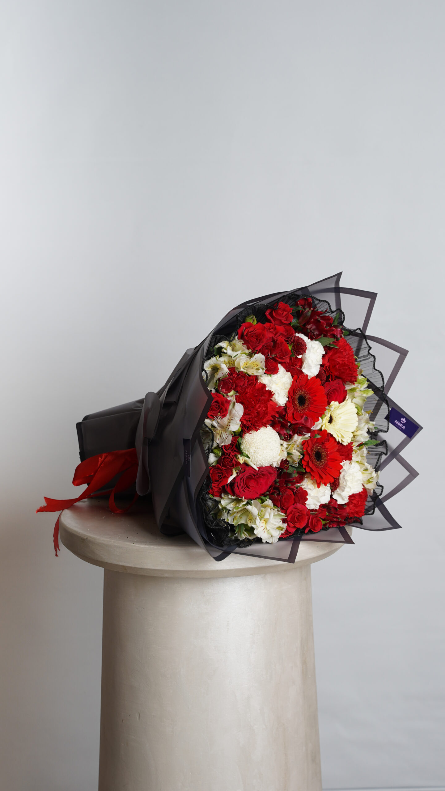 Description: A lavish bouquet of deep red blooms balanced with soft white florals, wrapped in elegant dark layers and designed to feel timeless, rich, and endlessly romantic.
