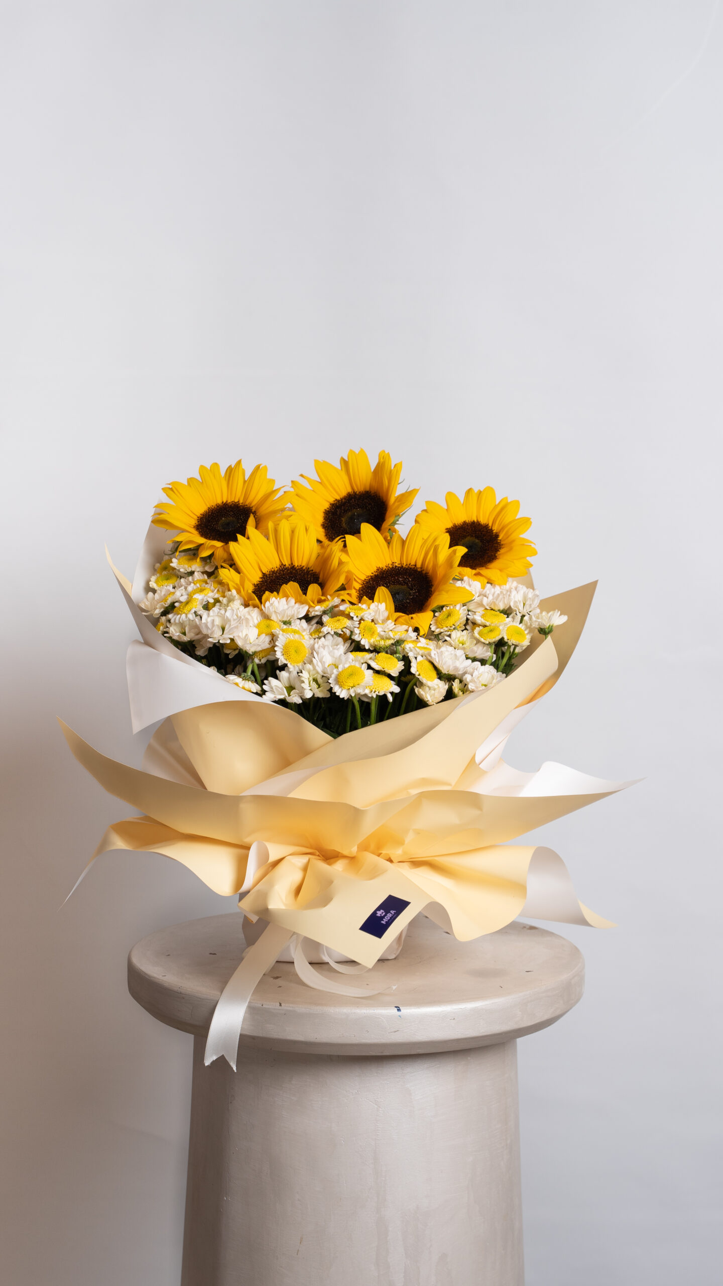 Description: A cheerful hand-tied bouquet showcasing vibrant sunflowers paired with soft white blooms, wrapped in warm, sunny tones. Joy is bright, optimistic, and full of life — a feel-good arrangement made to lift spirits and spread happiness instantly.