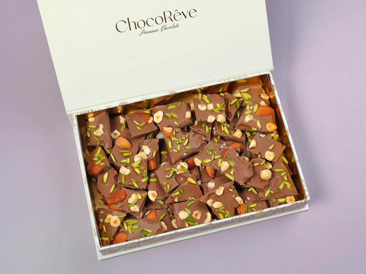 Description: Half kilo of premium Belgian chocolate topped with hazelnut, pistachio and almond