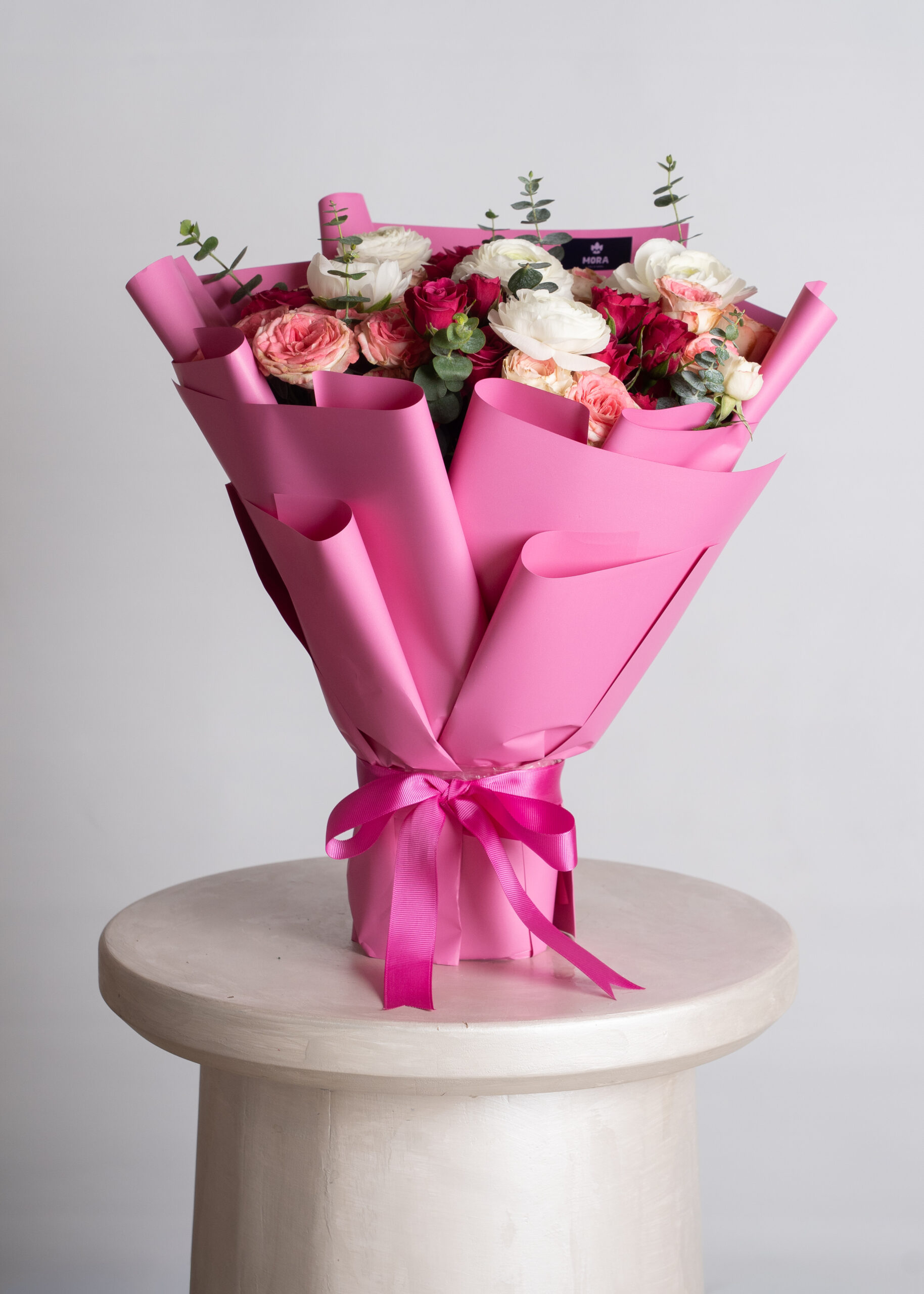 Description: A radiant composition of pink roses white ranunculus and blush blooms wrapped in vivid pink tones Nerina embodies cheerful sophistication and soft allure a bouquet that brings freshness and joy to any space.