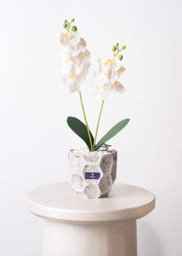 Description: Pristine white orchids with golden centers arranged in a sculpted stone pot with white pebbles. Orchidea Blanche - Artificial embodies purity and refinement. A decorative piece that radiates elegance. Size - Tall (60cm height) & Flowers - 2 orchid stems (artificial)
