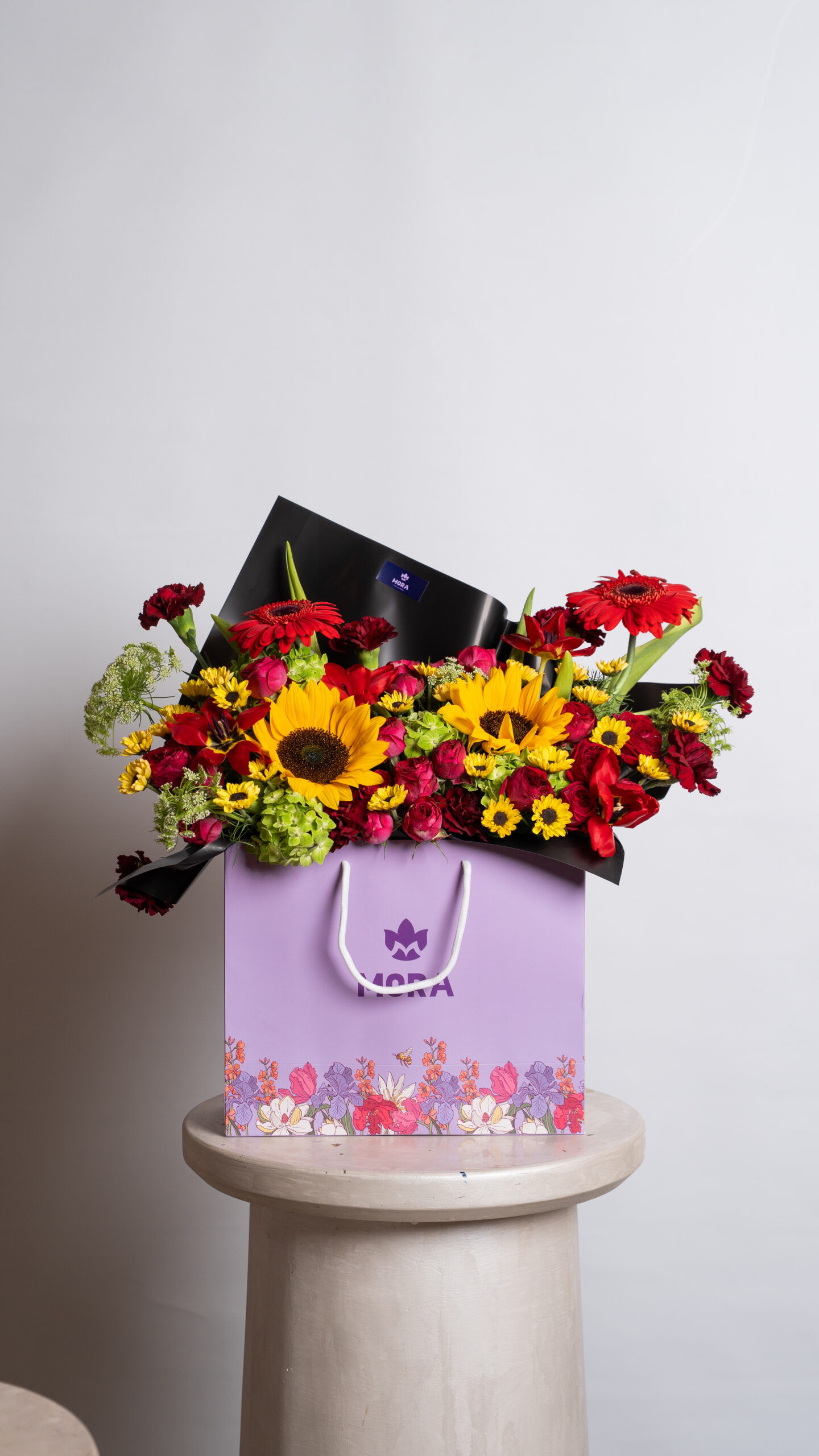 Description: A joyful arrangement bursting with radiant sunflowers, rich red blooms, and fresh green accents, presented in a signature gift bag and designed to feel uplifting, generous, and full of life.