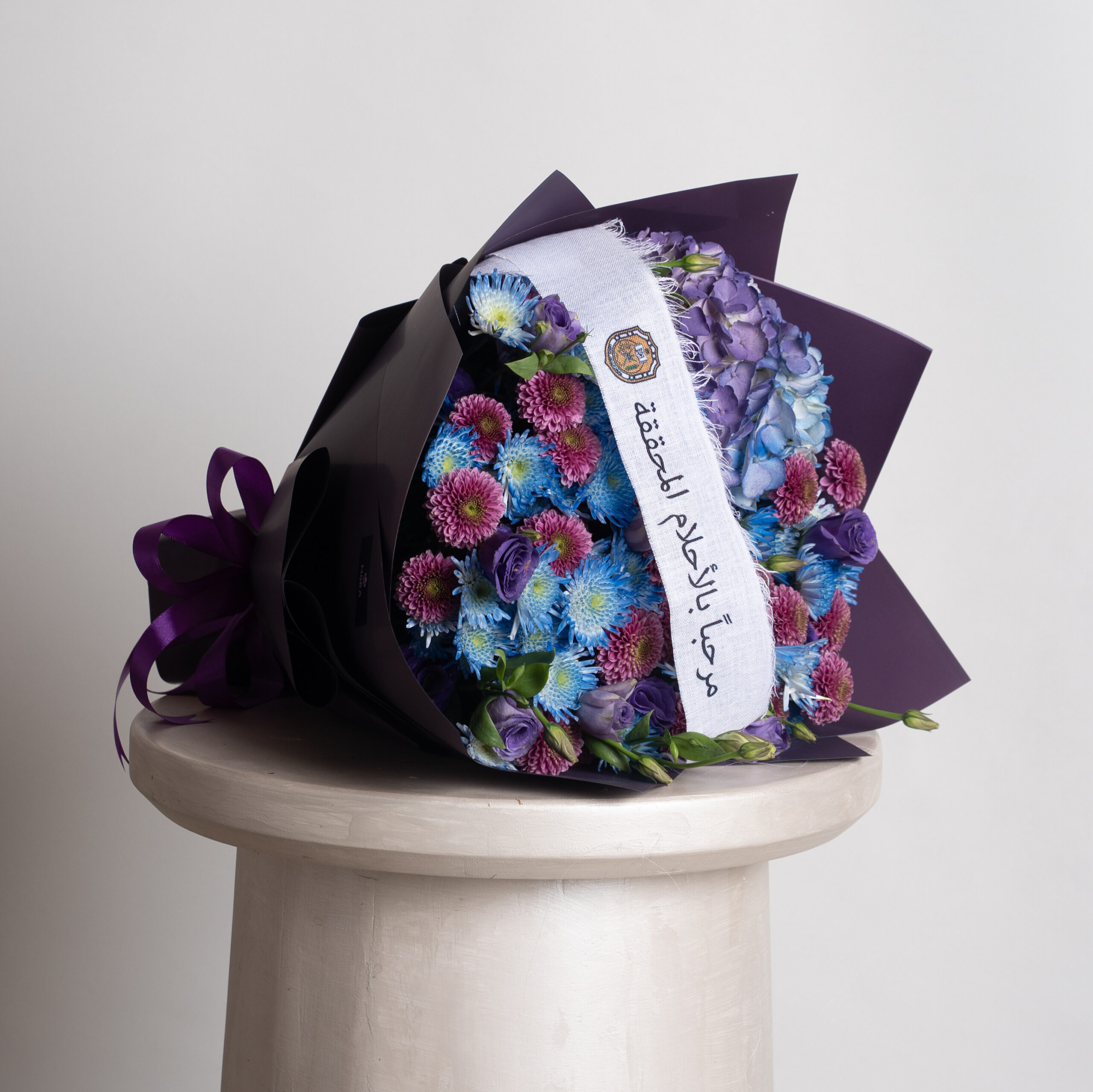 Description: A vibrant bouquet of blue and purple blooms celebrating elegance and pride in SQU colors. Contains Sash can be specified on checkout.