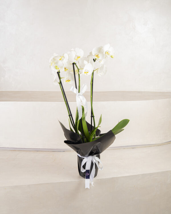 Description: An elegant display of pristine white orchids with golden centers and wrapped in black with a satin white ribbon. Blanche embodies purity and sophistication and a living statement of timeless grace.